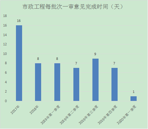 2020年第一季度我中心市政工程項目共審查1項,一次性審查通過0項,一次性審查通過率為0%;每批次一審意見完成時間為1天,與往年對比分析如下: