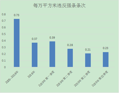 2019年第四季度我中心施工圖審查總建筑面積為278萬㎡,共審查出違反強制性條文64條,每萬平米違反強條0.23條次,與往年對比分析如下: