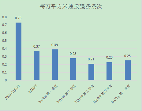 2020年第一季度我中心施工圖審查總建筑面積為205萬㎡,共審查出違反強制性條文51條,每萬平米違反強條0.25條次,與往年對比分析如下: